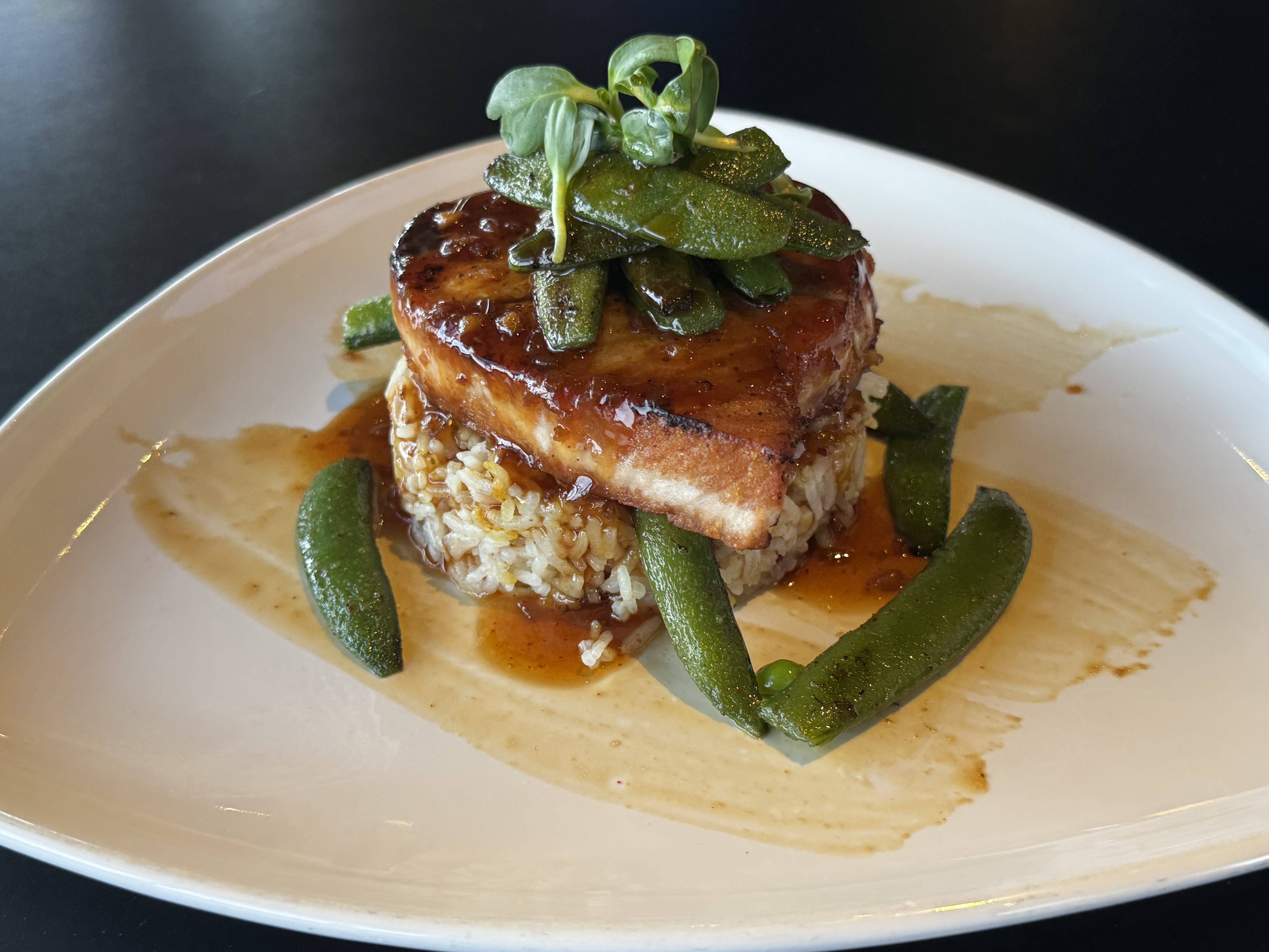 Mulligans Friday Seafood Special: Ginger Teriyaki glazed Ahi Tuna, Jasmine Rice & Sautéed Sugar Snap Peas.